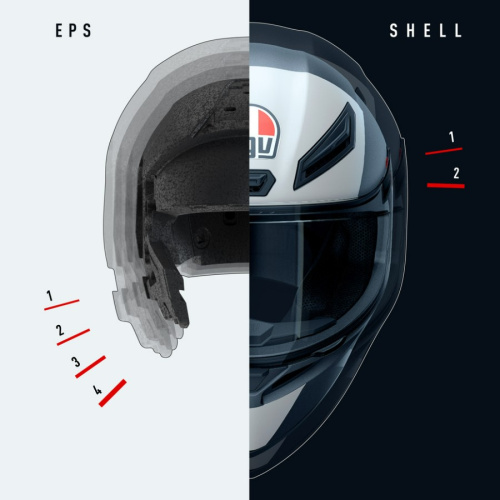 - 2 размера внешней оболочки и 4 размера внутренней оболочки из многоплотного EPS обеспечивают максимальную защиту от любого типа ударов.
