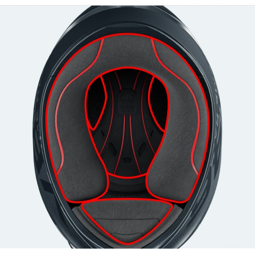 - Спойлер был разработан в аэродинамической трубе с новой конструкцией и двойным задним экстрактором для улучшения и увеличения рециркуляции воздуха и, следовательно, теплового комфорта внутри шлема.